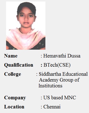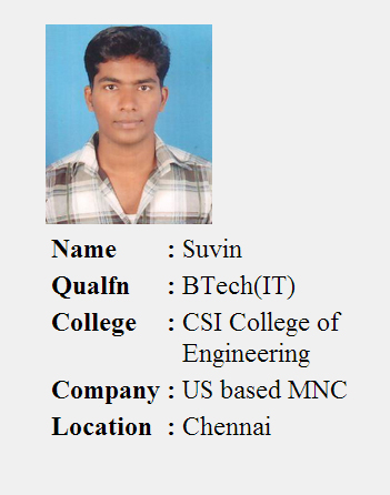 A very good learning place, Where we can gather technical knowledge from base to detail level with all realtime examples and a good practice of the technical stuffs. We can improve our technical knowledge much more better which helps us to create a good steady path in our career. - Rajeshwari, Btech(IT), Prince Shri Venkateshwara Padmavathy Engineering College